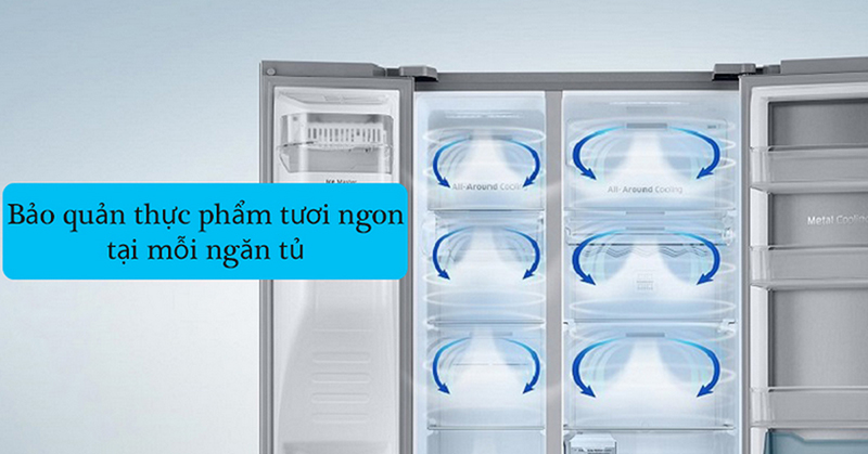 RS64R5101SL/SV được áp dụng công nghệ làm lạnh đa luồng khí (Multi Flow) và làm lạnh vòm (All-Around Cooling), hệ thống cửa thoát hơi lạnh được trang bị ở đều khắp các ngăn chứa nên luồng khí lạnh được phân bố, lan tỏa đồng đều khắp mọi ngóc ngách của tủ, giúp nhiệt độ và độ ẩm luôn được duy trì ổn định ở khắp các ngăn, ngay cả khi bạn mở tủ. Nhờ đó, các ngăn của tủ lạnh Samsung được làm lạnh đều, giúp bảo quản thực phẩm hiệu quả, tươi ngon hơn trong thời gian lâu hơn