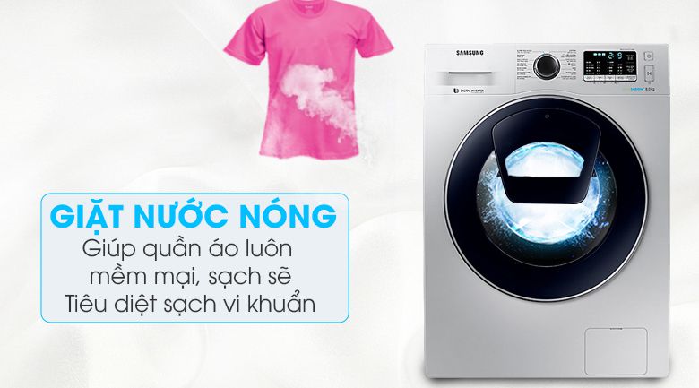 Với tính năng giặt nước nóng 90⁰C trên máy giặt Samsung sẽ giúp diệt khuẩn hiệu quả các vi khuẩn gây dị ứng, mầm bệnh, nhanh chóng đánh bay vết bẩn trên quần áo, giúp bạn yên tâm hơn.