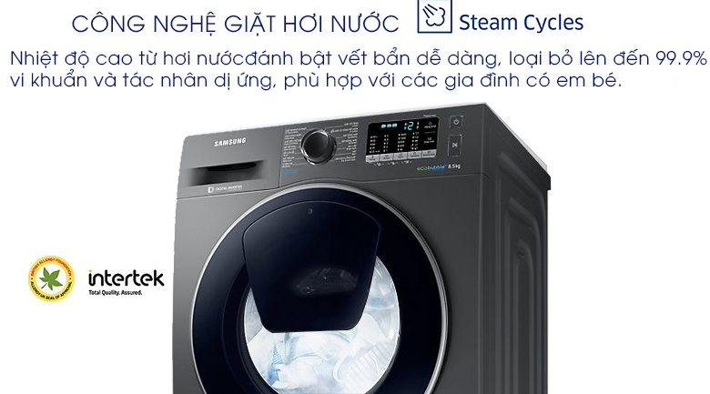 Với chức năng giặt hơi nước Steam Cycles trên máy giặt Samsung, nước sẽ được làm nóng thành hơi nước và liên tục phun vào quần áo, đặc biệt là không cần sử dụng bột giặt.