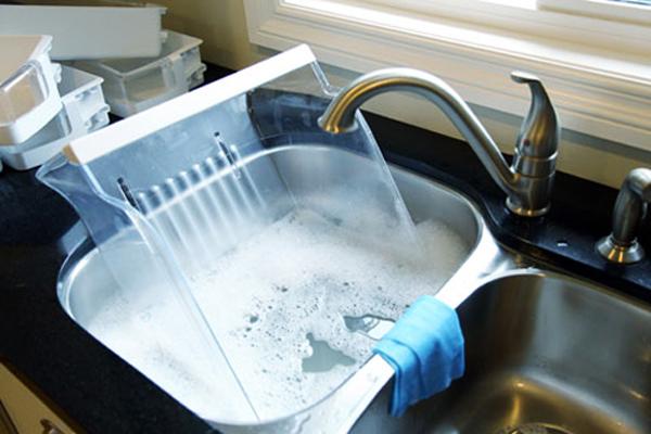 Tiến hành tháo rời các ngăn chứa: ngăn rau quả, ngăn đựng chai lọ, khay đựng trứng, khay làm đá ra khỏi tủ lạnh rồi cho vào chậu rửa bát để rửa sạch. Hoà nước rửa chén với một ít nước ấm để tẩy rửa dễ dàng hơn. Úp chúng cho ráo nước rồi mới được lắp lại vào tủ lạnh nhé.