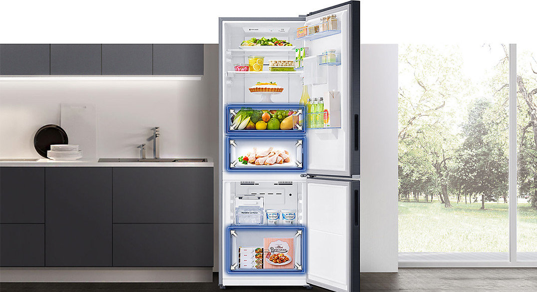 Khi nhu cầu làm đẹp cho căn nhà ngày càng tăng, đến chiếc tủ lạnh cũng phải đáp ứng trọn vẹn về thiết kế. Tủ lạnh ngăn đông dưới của Samsung với 2 màu xám Titan và bạc cùng thiết kế phẳng liền mạch có thể coi như món đồ nội thất trang trí cho phòng bếp thêm phần tinh tế.