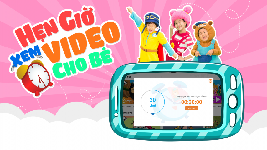 Nhiều bố mẹ có thói quen cho bé xem video hay sử dụng các thiết bị thông minh như điện thoại, máy tính bảng…và quên mất việc kiểm soát thời gian. Với tính năng Hẹn giờ của POPS Kids TV, việc theo dõi thời gian xem video của bé trở nên dễ dàng hơn bao giờ hết. Chỉ cần cài đặt, sau khi hết giờ, ứng dụng sẽ tự động khóa lại. Cách để bé có thể tiếp tục sử dụng là đưa bố mẹ nhập Khóa trẻ em. Và việc có cho bé xem tiếp hay không là do bố mẹ quyết định.