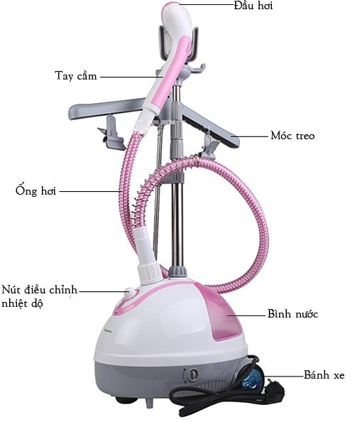 Không giống như bàn là hơi nước thông thường, bàn ủi hơi nước đứng Kangaroo KG755 gồm nhiều các phụ kiện như thân máy, đầu là, kẹp ly, thanh nâng, mắc áo, phễu,…