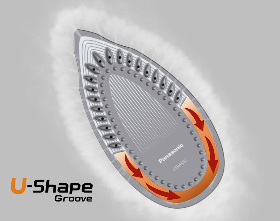 Là phẳng mỏi nếp nhăn với hơi phun mạnh và phân bổ đồng đều. Luồng hơi nước mạnh mẽ chạy dọc theo rãnh hình chữ U và tỏa đồng đều khắp mặt đế bàn ủi.