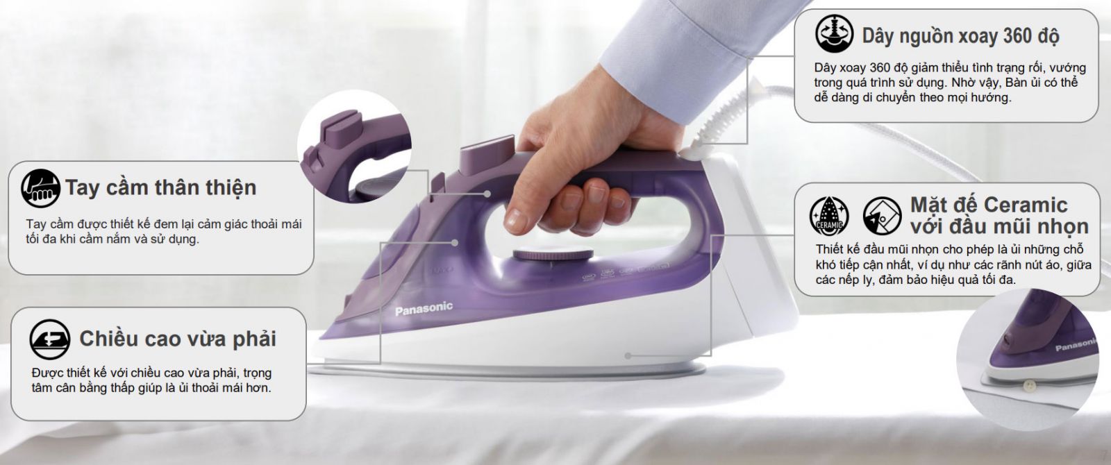Thiết kế độc đáo với tay cầm thuận tiện, cùng dây nguồn xoay 360 độ để quá trình là ủi được trơn tru. Mặt đế phủ Ceramic chống dính cao cấp, cứng cáp, và bền bỉ tuyệt đối.