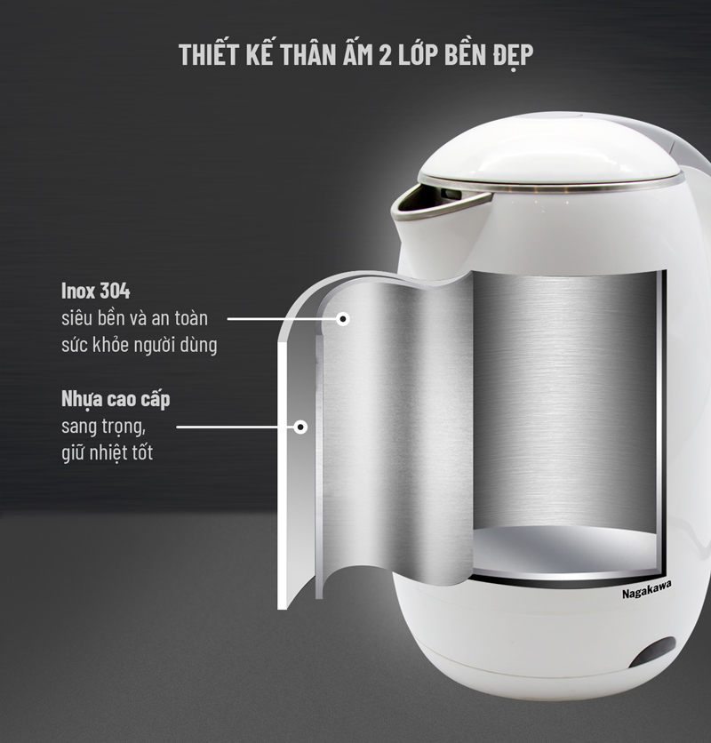 Thiết kế thân bình 2 lớp, gồm lớp ngoài là nhựa cao cấp chịu nhiệt tốt, độ sáng bóng đẹp và sang trọng, bên trong là inox 304 không gỉ, không gây độc hại cho người tiêu dùng, không làm sản sinh chất độc hại vào nước khi đun ở nhiệt độ cao, bền lâu khi sử dụng, nhờ đó đảm bảo sức khỏe cho người dùng.