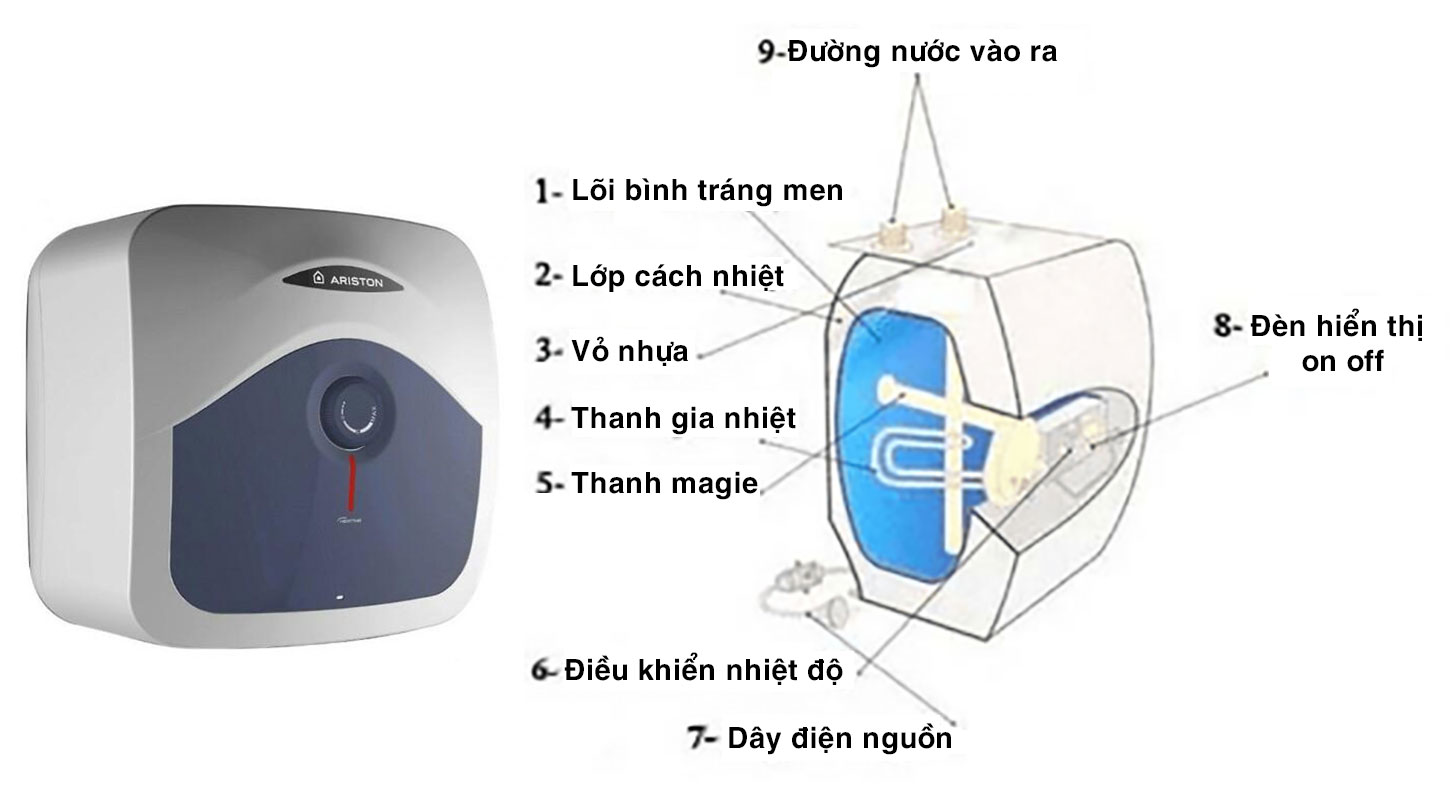 Bình nước nóng Ariston có kiểu dáng đơn giản, nhỏ gọn, phù hợp với mọi không gian phòng tắm gia đình. Với dung tích bình chứa 15 lít, máy nước nóng sẽ đáp ứng hoàn hảo cho nhu cầu sử dụng của gia đình 2-3 thành viên.
