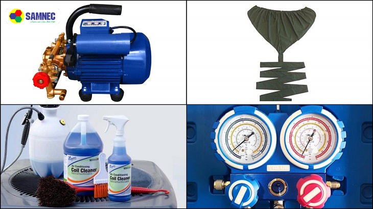 Máy bơm tăng áp: Đây là máy bơm nước với áp suất cao, dùng để xịt rửa các khe kim loại trên dàn nóng, dàn lạnh rất hiệu quả. Cách sử dụng bơm này rất đơn giản: Bạn chỉ cần cắm một đầu vòi vào chậu nước, đầu kia bấm nút để xịt nước bất cứ khi nào cần.