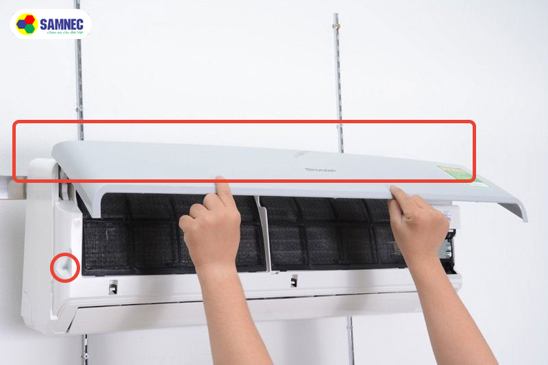 - Tháo ốc 2 bên và tháo những chốt cố định ở phía trên điều hòa.
