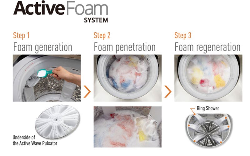 Bên cạnh đó, hệ thống 7 vòi nước phun (HydroActive) từ mọi hướng còn có tác dụng xả sạch quần áo sau khi giặt, đảm bảo cho bạn những bộ quần áo trắng sạch, không còn vi khuẩn hay bụi bẩn, an toàn cho sức khỏe gia đình bạn.