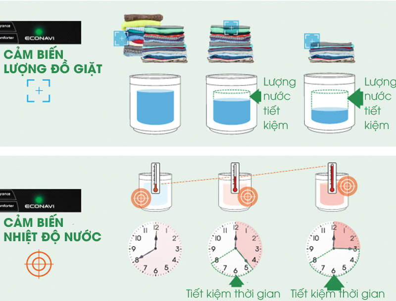 Dựa trên hệ thống cảm biến mới, công nghệ này cho phép máy giặt tự động nhận diện khối lượng quần áo, sau đó điều chỉnh mực nước phù hợp nhất, giúp tiết kiệm điện năng, nước và thời gian giặt quần áo.