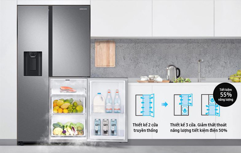 Được thiết kế với 3 cửa linh hoạt, tủ lạnh Side by Side từ Samsung mang đến hai ngăn mát và một ngăn đông trong một thiết kế duy nhất. Hai tủ mát được đặt đồng thời cả bên trên và bên dưới giúp giảm thiểu khí lạnh bị thoát ra đến 55%, tiết kiệm điện năng tối ưu và bảo quản trọn vẹn vị ngon của thực phẩm.