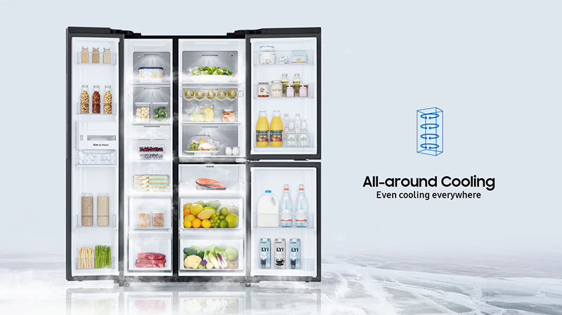 Với tủ lạnh lớn việc giữ nhiệt độ đều khắp rất quan trọng để giữ thực phẩm tươi lâu mà không đóng băng cục bộ. Công nghệ All Around Cooling giúp kiểm soát thay đổi nhiệt độ; cùng hệ thống họng gió riêng cho từng khay tạo luồng gió đảo chiều, giữ nhiệt độ đồng đều khắp các khu vực.