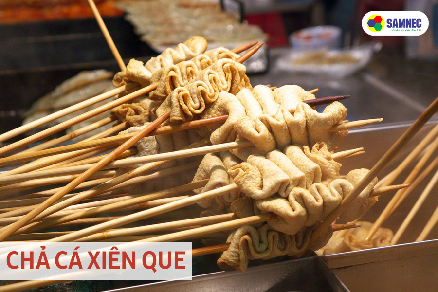 Cắt chả cá thành những miếng dọc chiều ngang 4-5 cm để cắm vào xiên que hoặc thái miếng tam giác. Lưu ý khi cho chả cá và xiên que, chả cá dễ bị đứt nếu mạnh tay.