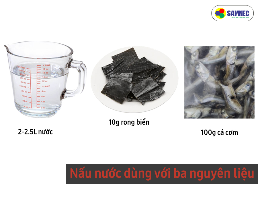 Sau đó đun một nồi nước sôi khoảng 2-2.5 lít, sau đó thả cá cơm vừa rang và tảo biển đun trong khoảng 15 phút rồi lọc lấy phần nước dùng.
