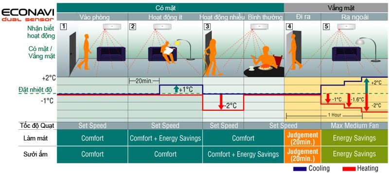 4. Tính năng Dò mức độ hoạt động: làm giảm công suất làm lạnh khi hoạt động của những người trong phòng giảm.