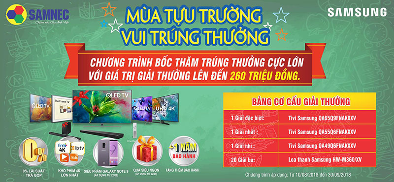Công ty CPQT Samnec thông báo chương trình khuyến mãi tùa tựu trường vui trúng thưởng nội dung như sau: