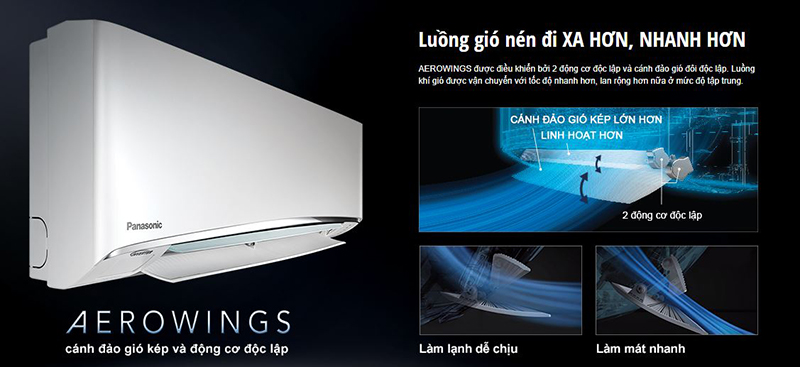 Aerowings được trang bị hai động cơ điều khiển hai cánh đảo gió hoạt động độc lập giúp hướng luồng không khí tập trung để làm mát phòng một cách hiệu quả. Hai cánh đảo gió có thể hướng luồng khí lạnh lên cao về phía trần nhà, không khí lạnh lan tỏa rộng khắp giúp làm mát đồng đều hay còn gọi là làm lạnh dễ chịu.