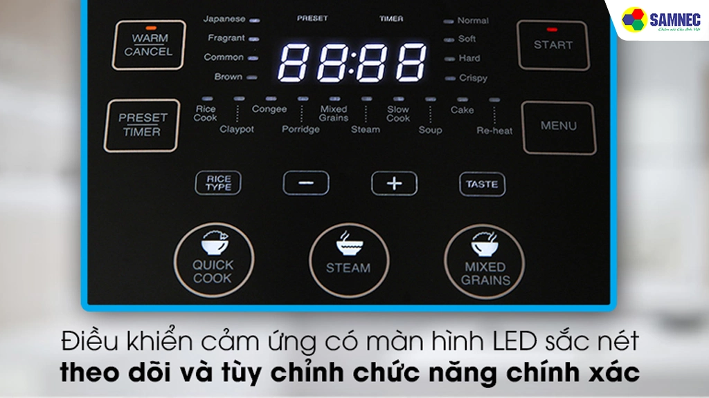 Van thoát hơi thông minh giữ hơi nước ổn định trong quá trình nấu, bảo toàn vitamin sẵn có trong gạo, cho cơm ngon dinh dưỡng trọn vẹn. Nồi được tích hợp sẵn các chế độ nấu nướng tiện ích đa dạng. Màn hình hiện đại giúp người dùng dễ dàng nhận biết các chức năng vận hành để sử dụng một cách tiện lợi nhất. Bạn có thể tùy chọn loại gạo, thời gian nấu cho phù hợp với khẩu vị gia đình nhất. Bảng điều khiển cảm ứng dễ dàng thao tác chỉ trong 1 nút chạm.
