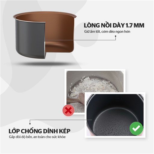 Lòng nồi dày 1.7mm, giữ ấm tốt, cơm dẻo thơm hơn