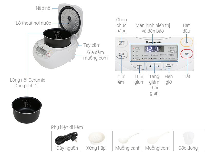 Đồng hồ hẹn giờ, Giữ ấm 12h, Nấu nhanh, Có bộ rung