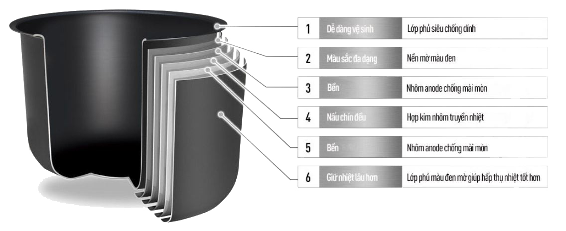 Lòng nồi dày 2,2 mm với 6 lớp vật liệu