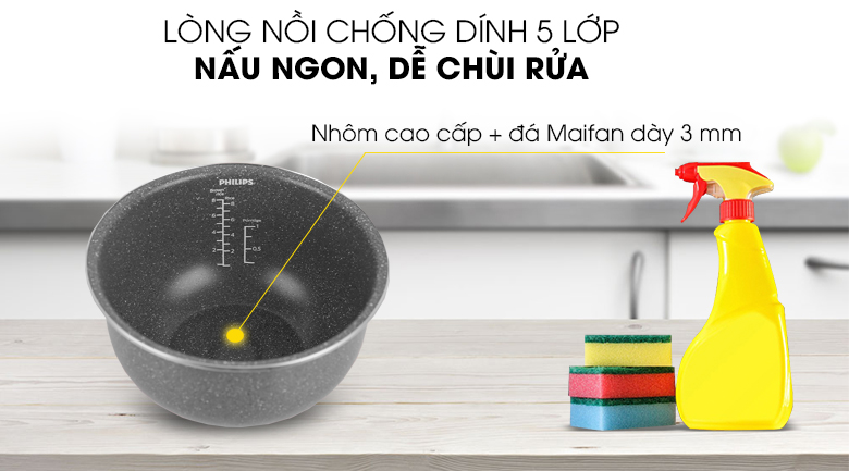 Lòng nồi làm bằng nhôm cao cấp kết hợp đá Maifan phủ 5 lớp chống dính dày 3 mm.
