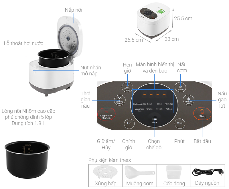 Lựa chọn cơm dẻo hay cơm mềm tuỳ thuộc vào sở thích người dùng cho mỗi bữa ăn, ngoài chức năng nấu cơm, nồi điện tử còn trang bị thêm 10 chức năng chế biến thức ăn đa dạng cho bữa cơm gia đình thêm ngon miệng: glutinous rice (xôi), bean (nấu đậu), soup (nấu đậu), porridge (cháo), japanese rice (nấu gạo nhật bản), grains (nấu hạt), steam (hấp), reheat (hâm nóng), brown rice (nấu gạo lứt).