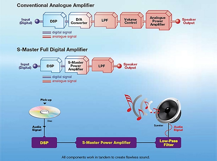 Không chỉ vậy, S-Master Digital Amplifier còn xử lý để loại bỏ tiếng ồn, độ nhiễu đến mức tối đa rồi mới phát ra loa ngoài, nhờ đó, công nghệ sẽ mang đến cho gia đình bạn những trải nghiệm âm thanh trong trẻo và tự nhiên, không bị rè.