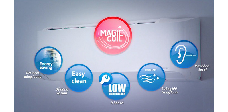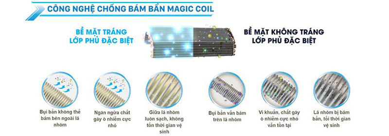 Magic Coil là hệ thống chống bám bẩn thông minh với bề mặt được tráng một lớp phủ đặc biệt, giúp ngăn chặn, không cho bụi bẩn bám trên bề mặt ngoài của lá nhôm. Nhờ thiết kế đặc biệt này, điều hòa sẽ ngăn ngừa được các tác nhân gây hại hoặc chất gây ô nhiễm cực nhỏ có trên dàn lạnh.