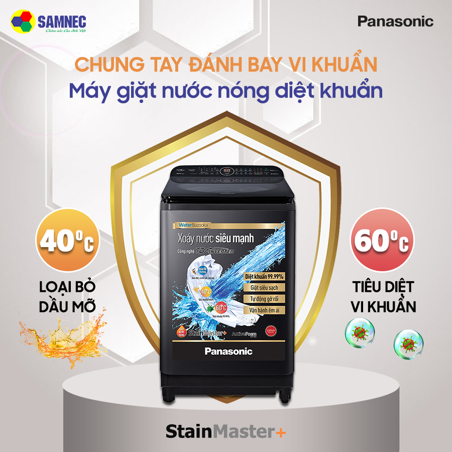 Bên cạnh việc loại bỏ mọi vết bẩn thông thường trên quần áo như công nghệ StainMaster trước đây, với những cải tiến vượt trội của công nghệ giặt nước nóng StainMaster+, máy giặt Panasonic cho phép người dùng có thể chọn chế độ nước nóng 40 độ C để tẩy sạch vết bẩn ở các vị trí khó giặt như cổ, tay áo, nếp gấp. Hoặc chọn chế độ giặt ở 60 độ C để hạn chế vi khuẩn (có thể tiêu diệt 99,99% vi khuẩn) bám trên sợi vải, ngăn ngừa bệnh viêm da, đặc biệt phù hợp với những gia đình có trẻ nhỏ hoặc người có làn da nhạy cảm.
