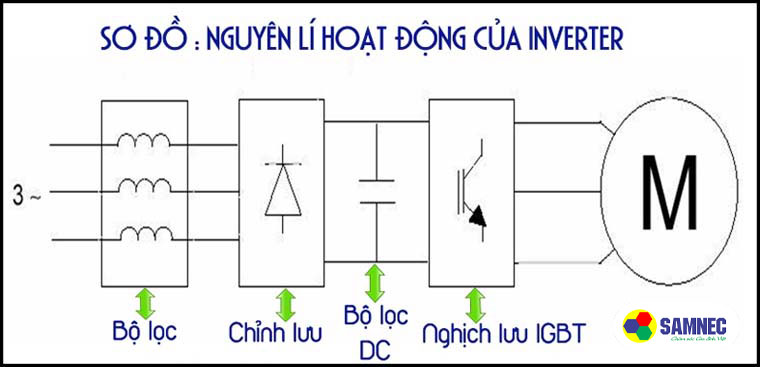 Công nghệ Inverter hoạt động dựa trên việc kiểm soát từng tần số dao động tùy theo thiết kế của các bo mạch bên trong. Nhờ vào sự tiến bộ của công nghệ vi xử lý và công nghệ bán dẫn lực mà Inverter còn có thể giảm tiếng ồn cho động cơ và giảm tổn thất trên lõi sắt động cơ. Ở thiết bị sử dụng công nghệ Inverter, nguồn điện xoay chiều 1 pha hoặc 3 pha sẽ được chỉnh lưu và lọc thành nguồn điện 1 chiều. Sau đó, điện áp 1 chiều được biến đổi thành điện áp xoay chiều 3 pha đối xứng.