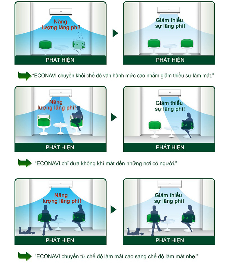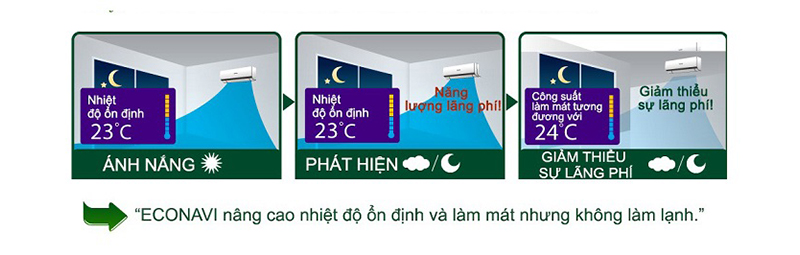 Econavi trên điều hòa Panasonic là một công nghệ cảm biến hiện đại, có thể nhận biết được sự có mặt của người trong phòng nhờ vào chuyển động của họ cũng như cảm thụ được cường độ ánh sáng (ban ngày, ban đêm), từ đó tự động điều chỉnh công suất làm lạnh sao cho phù hợp nhất, nhằm giảm thiểu sự lãng phí điện năng: