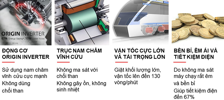 Do không sử dụng chổi than và thay thế lõi truyền thống bằng nam châm vĩnh cửu nên động cơ Origin Inverter không còn sự ma sát của các chổi than và lõi nữa. Từ đó, máy giặt khi hoạt động không gây ra ồn ào, vận hành êm ái, bền bỉ và không sinh nhiệt do ma sát. Chính vì vậy, máy sẽ không ảnh hưởng đến giấc ngủ của cả gia đình cũng như lúc bạn cần không gian yên tĩnh để tập trung làm việc.