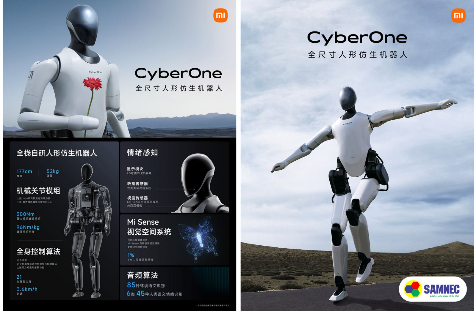“Robot hình người dựa vào thị giác để xử lý không gian xung quanh chúng. Được trang bị mô-đun thị giác chiều sâu Mi-Sense tự phát triển, kết hợp với một thuật toán tương tác AI, CyberOne có khả năng nhìn nhận không gian 3D, cũng như nhận dạng con người, cử chỉ và biểu cảm, cho phép nó không chỉ thấy mà còn xử lý được môi trường xung quanh. Để giao tiếp với thế giới, CyberOne được trang bị bộ máy nhận dạng ngữ nghĩa môi trường MiAI và bộ máy nhận dạng cảm xúc giọng nói MiAI (cũng do Xiaomi tự phát triển), cho phép nó nhận dạng 85 loại âm thanh môi trường và 45 cảm xúc con người. CyberOne có thể phát hiện ra trạng thái vui vẻ, và thậm chí là xoa dịu người dùng mỗi khi buồn bã. Tất cả những chức năng đó đều được tích hợp vào bộ xử lý của CyberOne, vốn được kết nối với một mô-đun OLED cong để hiển thị thông tin tương tác thời gian thực”
