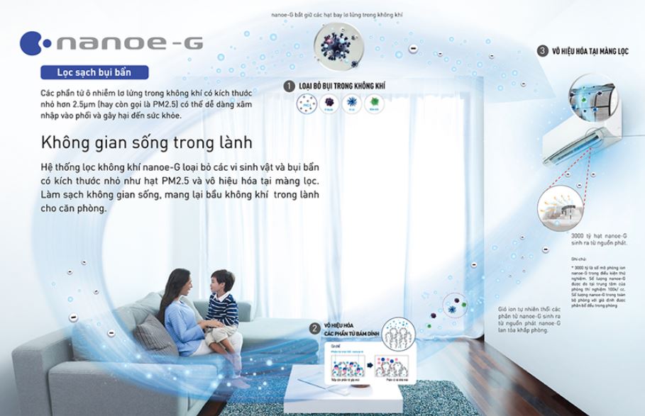 Nanoe-G giải phóng các ion âm xung quanh điều hòa. Các ion này sẽ gắn kết với các hạt bụi theo dòng không khí vào trong ống nạp khí của điều hòa. Sau đó, các hạt bụi tích điện âm này bị màng lọc tích điện dương giữ lại và vô hiệu hóa giúp diệt vi khuẩn, lọc bụi, đảm bảo an toàn sức khoẻ cho gia đình bạn.