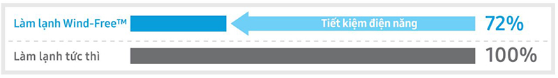 Chế độ Làm Lạnh Wind – Free giảm mức tiêu thụ điện năng lên đến 72% so với chế độ Làm Lạnh Nhanh Thông Thường. Ở điều hòa Wind – Free Cooling, máy nén vận hành với tần suất thấp nhất để duy trì không gian mát lành mà bạn mong muốn, động cơ quạt bên trong hoạt động với số vòng quay tối thiểu. Vì vậy bạn vẫn có thể tận hưởng sự mát lành thư thái trọn ngày dài mà chẳng cần lo về hóa đơn điện.