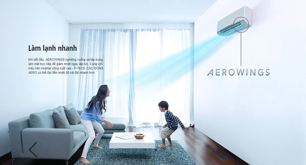 Aerowings được trang bị hai động cơ điều khiển hai cánh đảo gió hoạt động độc lập giúp hướng luồng không khí tập trung để làm mát phòng một cách hiệu quả. Hai cánh đảo gió có thể hướng luồng khí lạnh lên cao về phía trần nhà, không khí lạnh lan tỏa rộng khắp giúp làm mát đồng đều hay còn gọi là làm lạnh dễ chịu.
