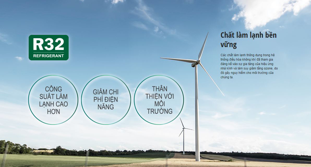 Để ứng phó với tình trạng biến đổi khí hậu, Panasonic đã sử dụng môi chất lạnh thế hệ mới R-32 cho dòng sản phẩm của mình. Gas R-32 có ưu điểm là hiệu quả làm lạnh cao, không gây suy giảm tầng ozone và có chỉ số làm nóng trái đất thấp.
