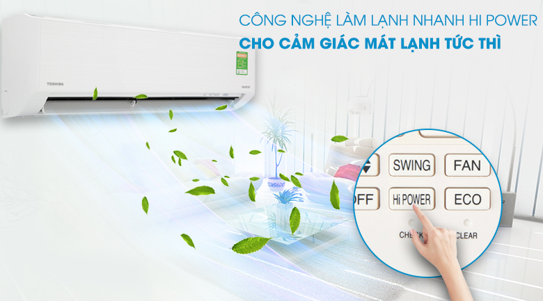 Máy lạnh Toshiba Inverter được trang bị chế độ làm lạnh nhanh Hi Power, giúp giảm xuống 3 độ C cánh đảo gió sẽ quạt ở tốc độ tối đa, nhanh chóng đưa căn phòng đạt đến nhiệt độ cài đặt, mang lại cho bạn cảm giác mát lạnh tức thì chỉ trong tích tắc.