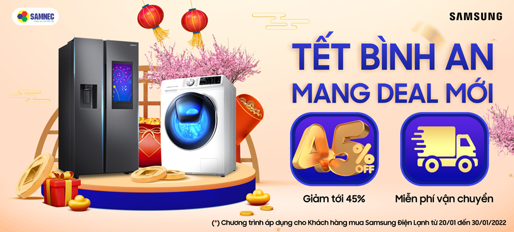 - Giảm giá cực sốc lên đến 45% cho các sản phẩm tủ lạnh và máy giặt Samsung.