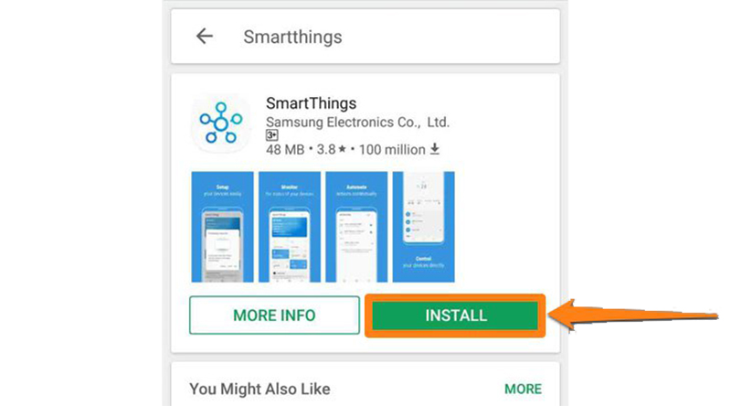 Bước 1: Bạn có thể tìm theo tên của ứng dụng là "SmartThings" trong kho ứng dụng trên điện thoại (Android và iOS)., bạn chọn vào mục "INSTALL" để cài đặt ứng dụng.