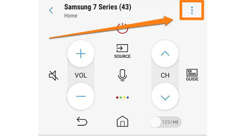 Giao diện chính của bộ điều khiển tivi với đầy đủ các nút như nguồn, home, phím điều hướng, tăng giảm âm lượng, chuyển kênh,... trên ứng dụng SmartThings.
