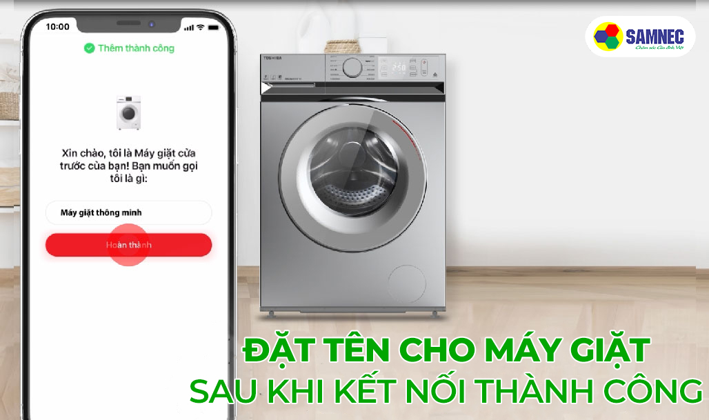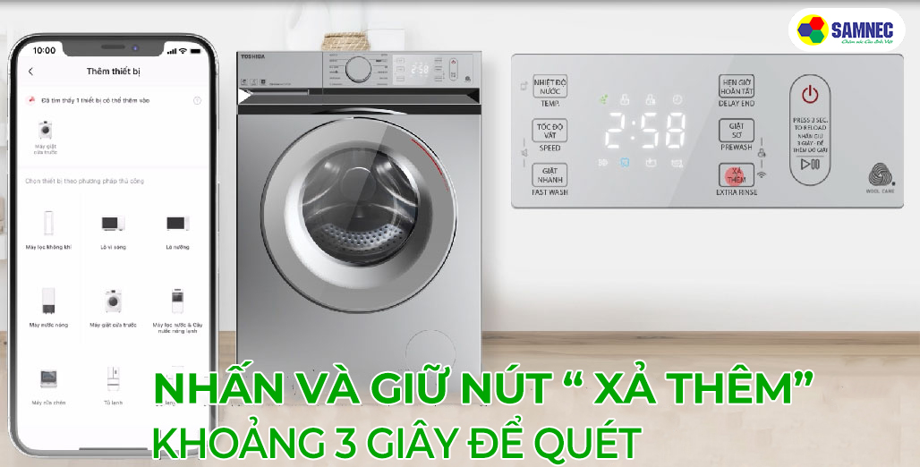 Sau khi ấn thêm thiết bị trên ứng dụng bạn vui lòng ấn và giữ nút "XẢ THÊM" (trên máy giặt) khoảng 3 giây để quét thiết bị.
