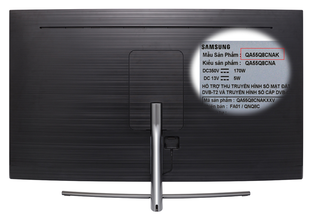 Cách 1: Bạn chỉ cần xem model tivi ở trên tem dán mặt sau của tivi, dòng chữ được bắt đầu bằng 2 chữ “Model No.”, mã số tiếp theo chính là tên model sản phẩm, như trong hình thì đây là model QA55Q8CNAKXXV.
