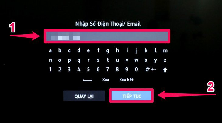 Bước 6: Bạn nhập số điện thoại hay email đã đăng ký tài khoản Fim+ (1) sau đó chọn "Tiếp tục" (2).