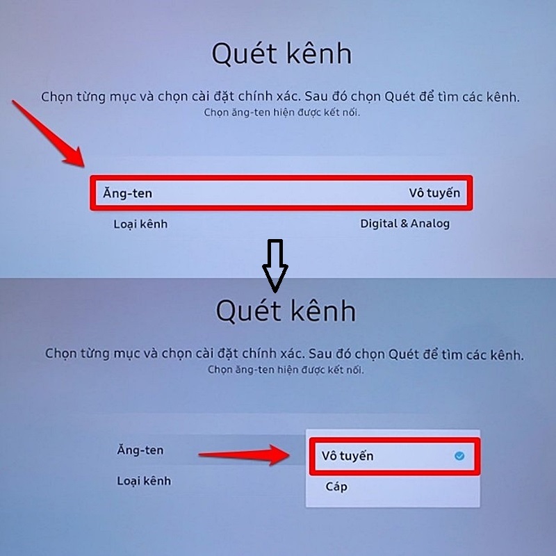 Bước 6: Bạn chọn vào mục "Ăng-ten" và “Vô tuyến”.