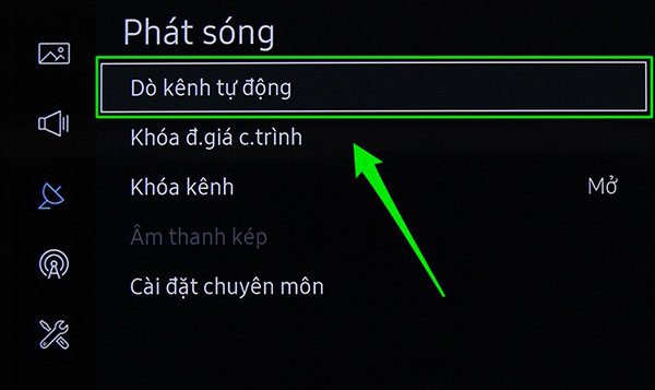- Bước 3: Trong phần Cài Đặt, chọn mục Phát Sóng (mục thứ 3 bên tay trái), rồi chọn Dò Kênh Tự Động.
