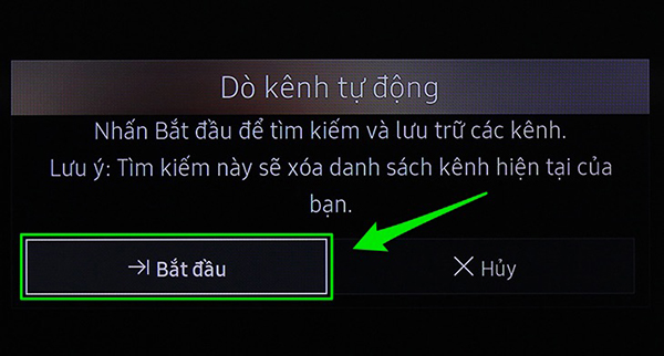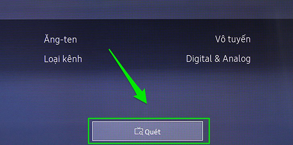 - Bước 6: Sau khi chọn xong 2 mục trên ta bấm chữ Quét để Tivi tiến hành quét tự động.