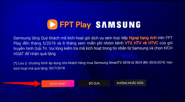 Hướng dẫn kích hoạt gói khuyến mãi FPT Play trên các dòng smart tivi Samsung 2018